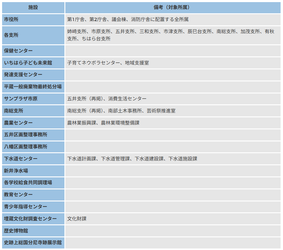 市役所守衛室や消防署等の24時間体制の施設、公民館など指定管理者が管理する施設については対象外です。