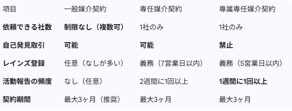 まずは、3種類の契約(一般・専任・専属専任)の違いを一覧表で確認しましょう。