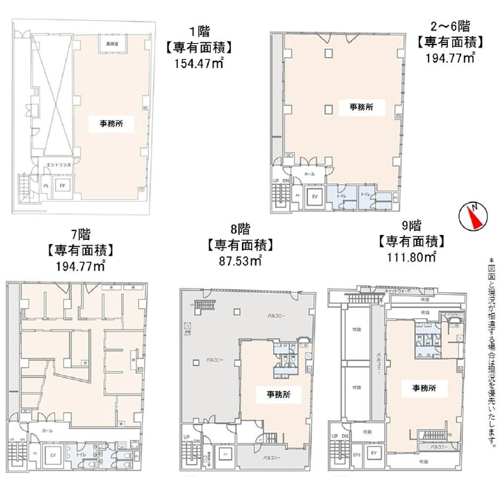 1階:154.47㎡ 2階~6階194.77㎡ 7階194.77㎡ 8階87.53㎡ 9階111.80㎡