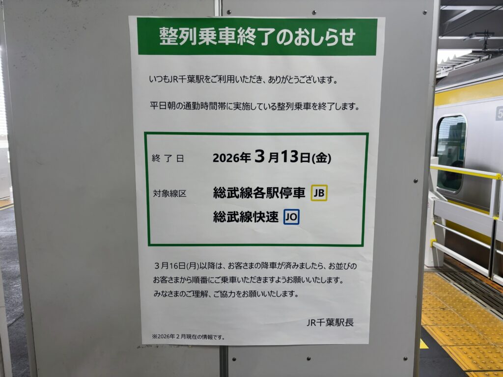 総武線各駅停車・快速で平日朝の通勤時間帯に実施していた整列乗車が、2026年3月13日(金)をもって終了するそうです。
