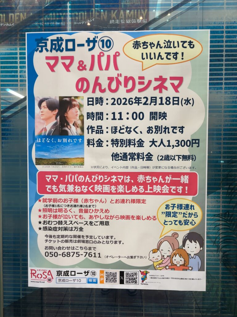 2026年2月18日(水曜日)、京成ローザ⑩にて就学前のお子様(赤ちゃん)連れ限定の映画鑑賞イベント「ママ&パパのんびりシネマ」が開催されます。