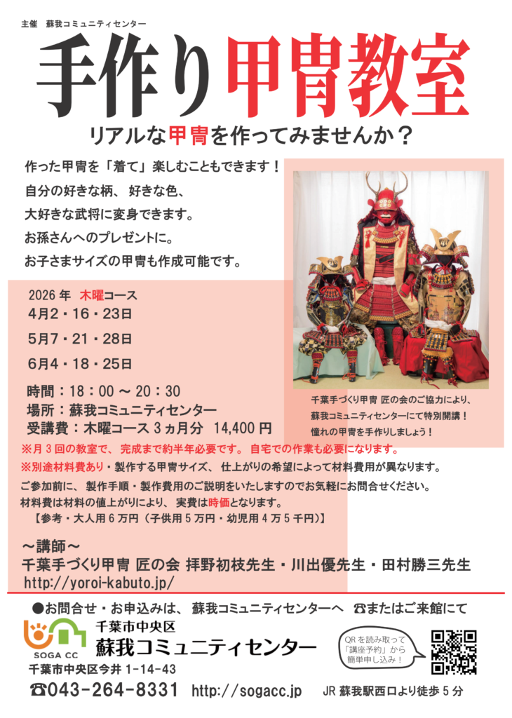 ・甲冑製作教室の開催: 蘇我コミュニティセンターや酒々井中央公民館などで定期的に教室を開いています。初心者でも半年ほどかけて自分だけの一領(一式)を完成させることができます。