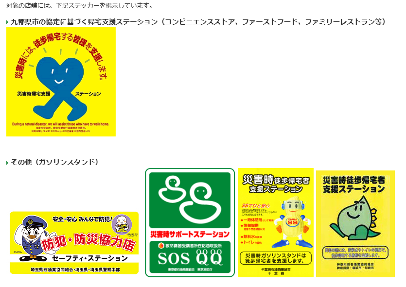 そのような事態に備え、千葉県を含む九都県市では、徒歩で帰宅する方をサポートするための協定をコンビニエンスストアやファミリーレストラン、ガソリンスタンド等の民間施設と締結しています。