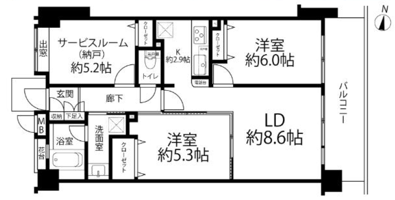 ・約8.6帖のLDKに加え、約6.0帖と約5.3帖の洋室、さらに約5.2帖のサービスルーム(納戸)を備えており、テレワーク部屋や収納スペースとしても活用できます 。