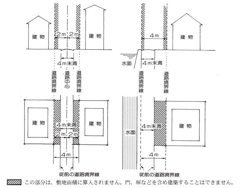 この要件を満たさない敷地は、原則として建物を建てることができず、「再建築不可」となります。(建築審査会の許可により、再建築が可能となる場合があります。)