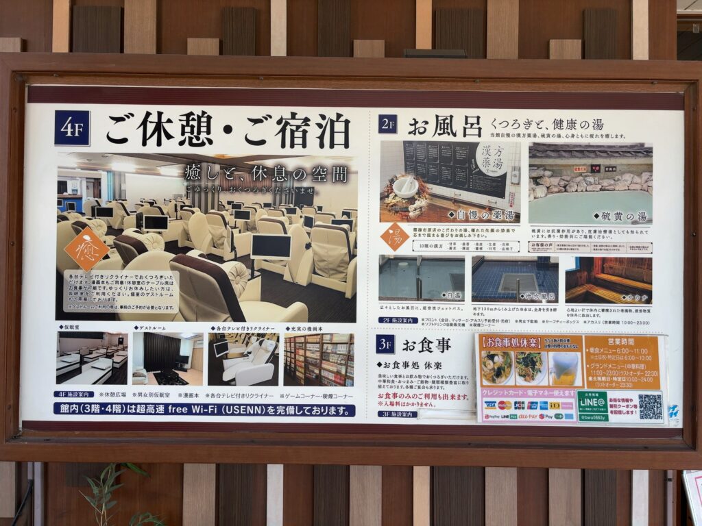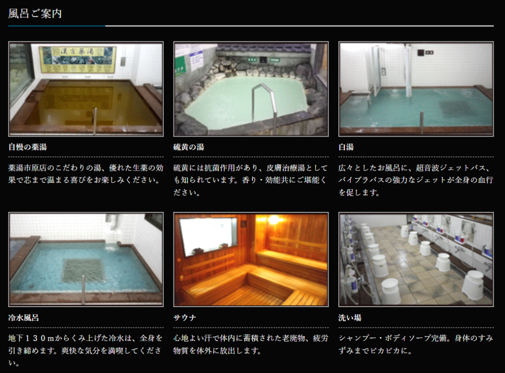 24時間年中無休、9種類の薬湯とサウナ、食事が楽しめ、宿泊もできる施設です。
